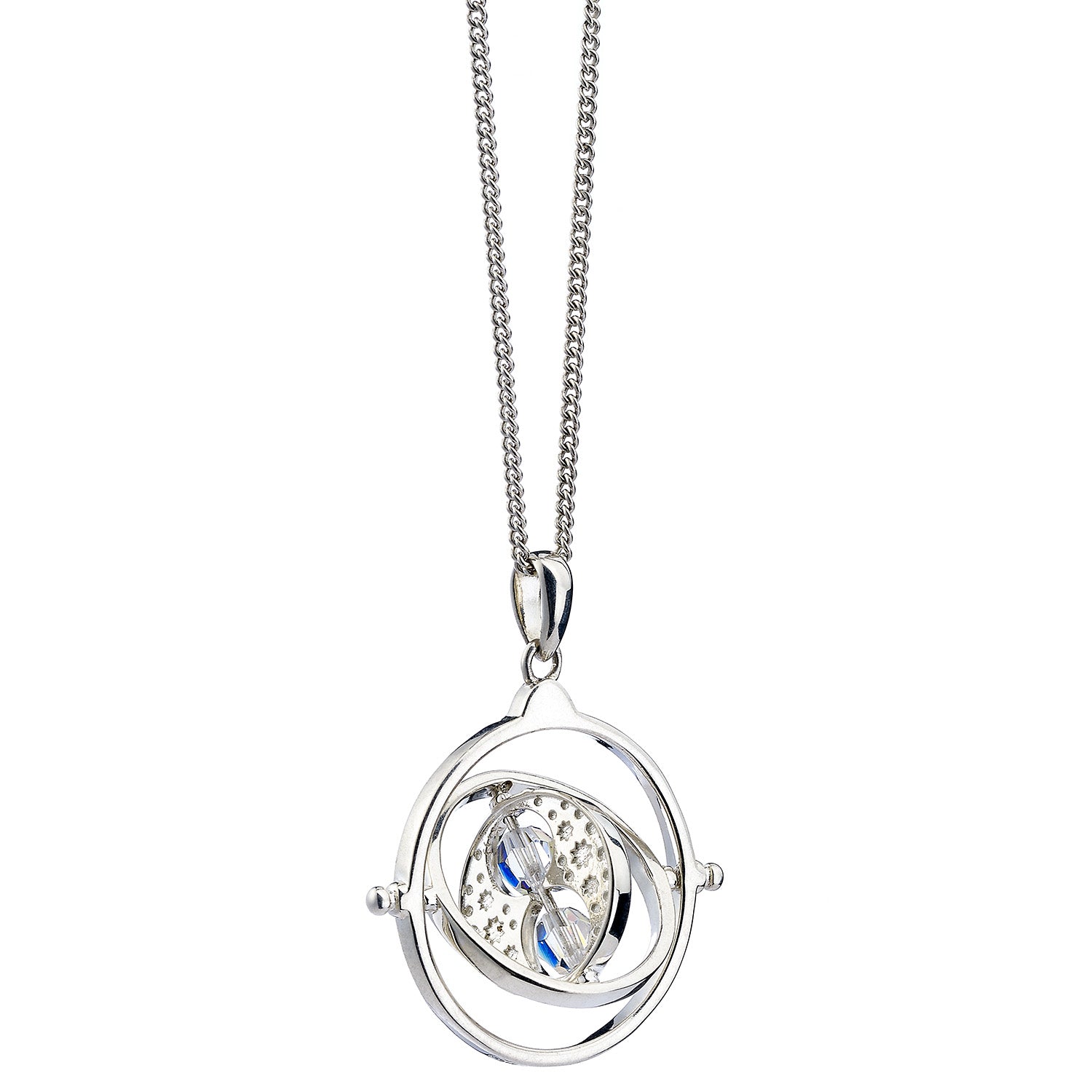 This lovely time turner replica rotates and spins much like Hermione's. Professor Dumbledore gave this gadget to Hermione Granger to help her manage her hectic academic schedule. The pendant is approximately 28mm tall and 28mm wide. Sterling silver pendant with Crystal Elements. A Sterling Silver curb chain with an 18-inch length is used for the necklace. This necklace is packaged in a Harry Potter-themed box.