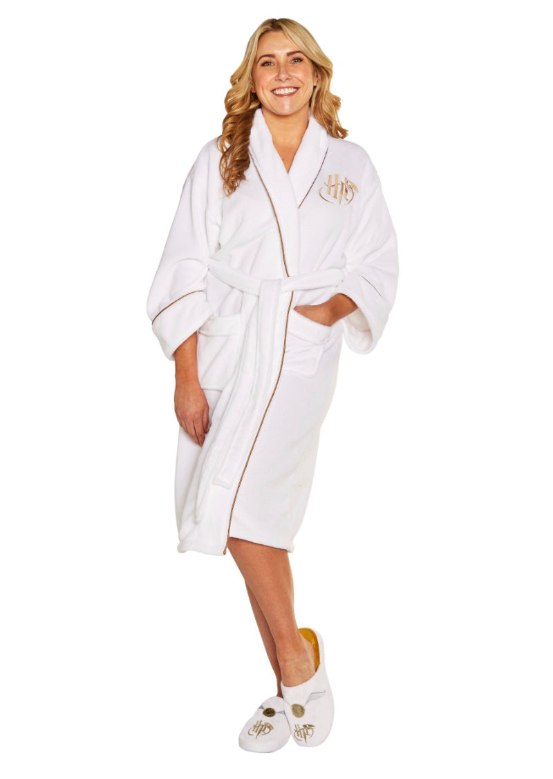 Bathrobe in gold and white with the famous Golden Snitch on the back and Harry Potter Logo on the front left chest. The perfect robe to take away for the weekend or just lounge at home catching up on your favourite wizard film. One size fits most.