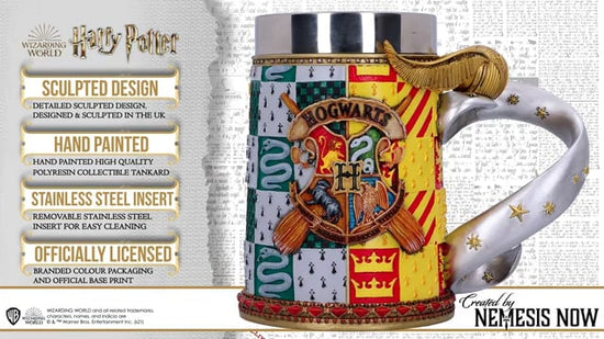 With this superbly created Golden Snitch collectible Tankard, you can show your devotion for Quidditch. The Golden Snitch, often known as the Snitch, is the third and smallest Quidditch ball. It's a gold-colored spherical the size of a walnut with silver wings. It flies fast around the Quidditch pitch, halting and lingering in position at times. The purpose of the Seeker is to catch the Snitch before the other team's seeker, which is worth 150 points. The game can only come to an end when the Snitch is caught! On this finely constructed Tankard, the Snitch serves as an exquisite handle, and the Hogwarts symbol is proudly engraved on the front. This item is the perfect addition to any wizarding collection and may be appreciated by witches, wizards, and Muggles alike. It is cast in the finest resin before being magically hand-painted.