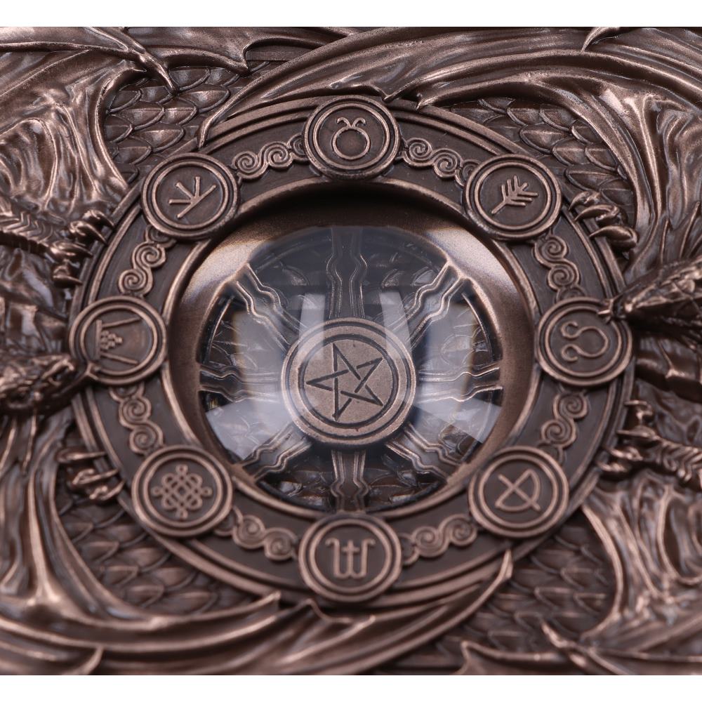 From the imagination of world-renowned gothic and fantasy artist Anne Stokes, comes this Dragons of the Sabbats Tarot Box. Inspired by the Wheel of the Year, which can be seen in the center of the lid, this box features an array of dragons, each of which relates to the various pagan festivals which take place throughout the year. Cast in the finest resin before being expertly finished in bronze, this piece is perfect for any Dragon enthusiast who seeks to honour their pagan traditions.