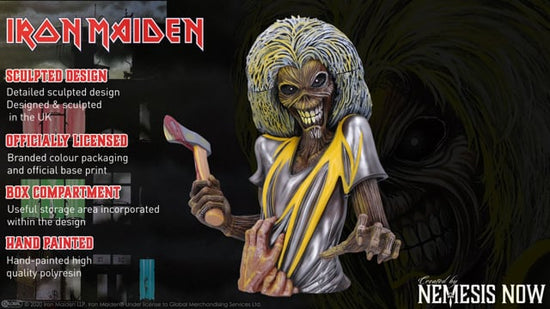 Show your allegiance to the Monsters of Rock with this electrifying and officially licensed Iron Maiden Killers Bust Box. The zombie-like mascot stares forward with piercing eyes, intimidating all those that pass by. He stands with a bloody axe in his right hand as his left points towards the viewer. A victim grasps at his shirt, presumably taking his last breath...At the very top, his scalp can be removed to show a small storage space, perfect for keeping your most treasured belongings. Cast in high-quality resin before being carefully hand-painted, this ideal piece of rock memorabilia will bring terror and excitement to any Maiden fan's soul!