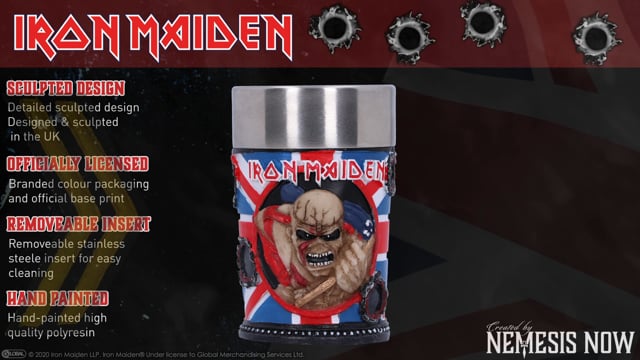 With this exciting and officially licenced Iron Maiden shot glass, produced by Rock & Roll masters Nemesis Now, show your allegiance to the Monsters of Rock. Eddie the Trooper surges forward, encapsulating the band's fierce determination and dedication over the years. A waving union jack decorates the back of the shot glass, making it ideal for toasting fallen troopers. Each is hand-painted in high-quality resin and includes a removable stainless steel insert so you can spend less time cleaning and more time rocking!
