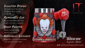 Prepare to face your fears with this officially licenced IT Time To Float Collectible Tankard. On the front of the tankard, Pennywise is pictured, leaning forward in his recognisable clown suit and staring up at you with his scary yellow eyes and an evil leer. Red balloons encircle the tankard and go all the way around it. Pennywise's hand is shown gripping a handful of red balloons, the cup's handle bearing the iconic motto "Time to float." This one-of-a-kind tankard, cast in the finest resin and expertly hand-painted, is the perfect addition to any horror collection!