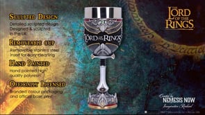 The handle of the sword Narsil, the longsword wielded by King Elendil during the War of the Last Alliance and used by his son, Isildur, to remove the One Ring from Sauron's hand, forms the stem of this Goblet. It was afterwards reforged into Anduril, which would eventually become Aragorn's sword. The crown of Aragorn, who was crowned King Elessar of Gondor following Sauron's destruction, is encircled around the base of the Goblet. The rim's detailing is similar to that of the White Tree and the Ring of Barahir. The cup's background is made up of his chainmail and armour, with the words 'Lord of the Rings' imprinted on the front.