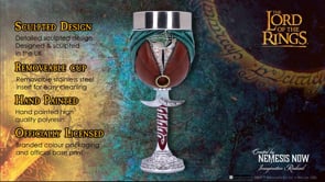 The short-sword Sting, which Bilbo Baggins bequeathed on to his cousin Frodo, forms the stem of this Goblet. Frodo's green cloak, the front of his brown buttoned blazer over his off-white shirt, and the One Ring dangling from a chain around his neck are all visible. The classic Leaf of Lorien sits just below the upper rim and serves as the ideal focal point. This exquisitely designed piece is expertly hand-painted after being cast in the finest 'Elvish' resin.