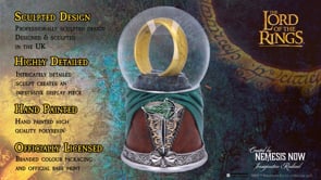 Frodo's green cloak and the front of his brown buttoned blazer atop his off-white shirt form the base of this nicely made snow globe. The classic Leaf of Lorien sits just below the upper rim and serves as the ideal focal point. The quote 'Even the smallest person can change the course of the future' is engraved on the reverse. The One Ring takes centre stage within the globe, surrounded by an inscription that reads "One Ring to Rule Them All." This exquisitely crafted sculpture is expertly hand-painted after being cast in the best 'Elvish' resin.