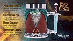 The handle of this Tankard Is formed by the short-sword Sting, which Bilbo Baggins passed to his cousin Frodo. Frodo's green cloak, the front of his brown buttoned blazer over his off-white shirt, and the One Ring dangling from a chain around his neck are all visible. The classic Leaf of Lorien sits just below the upper rim and serves as the ideal focal point. The slogan 'Even the smallest person can change the course of the future' is engraved on the back, which is encircled by the inscription on the One Ring, which translates to 'One Ring to Rule Them All.' This exquisitely crafted sculpture is expertly hand-painted after being cast in the best 'Elvish' resin.
