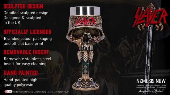 This officially licenced Slayer Goblet, designed by metal masters Nemesis Now, pays homage to the thrash metal gods. This piece, which features Slayer's fast tremolo picking, double bass drumming, and shouted vocals, was designed to incorporate their Helmet Skull band artwork. This hand-painted Goblet is made of high-quality resin and has a removable stainless steel insert so you can spend less time cleaning and more time moshing!