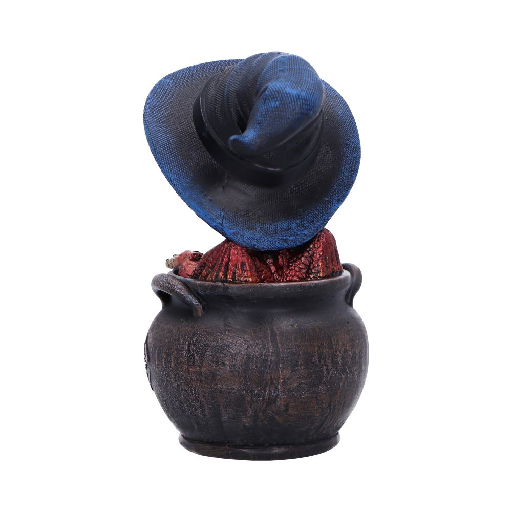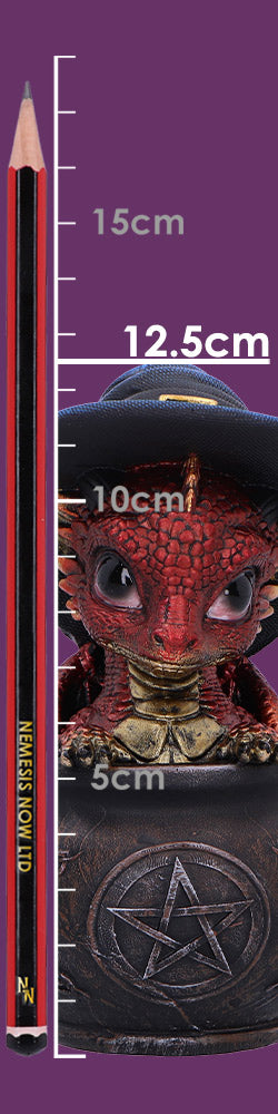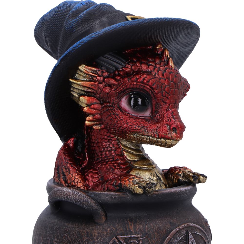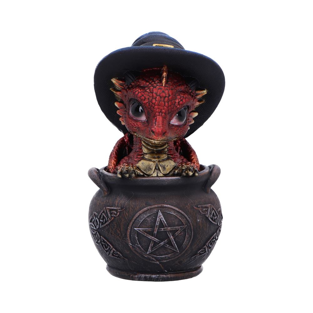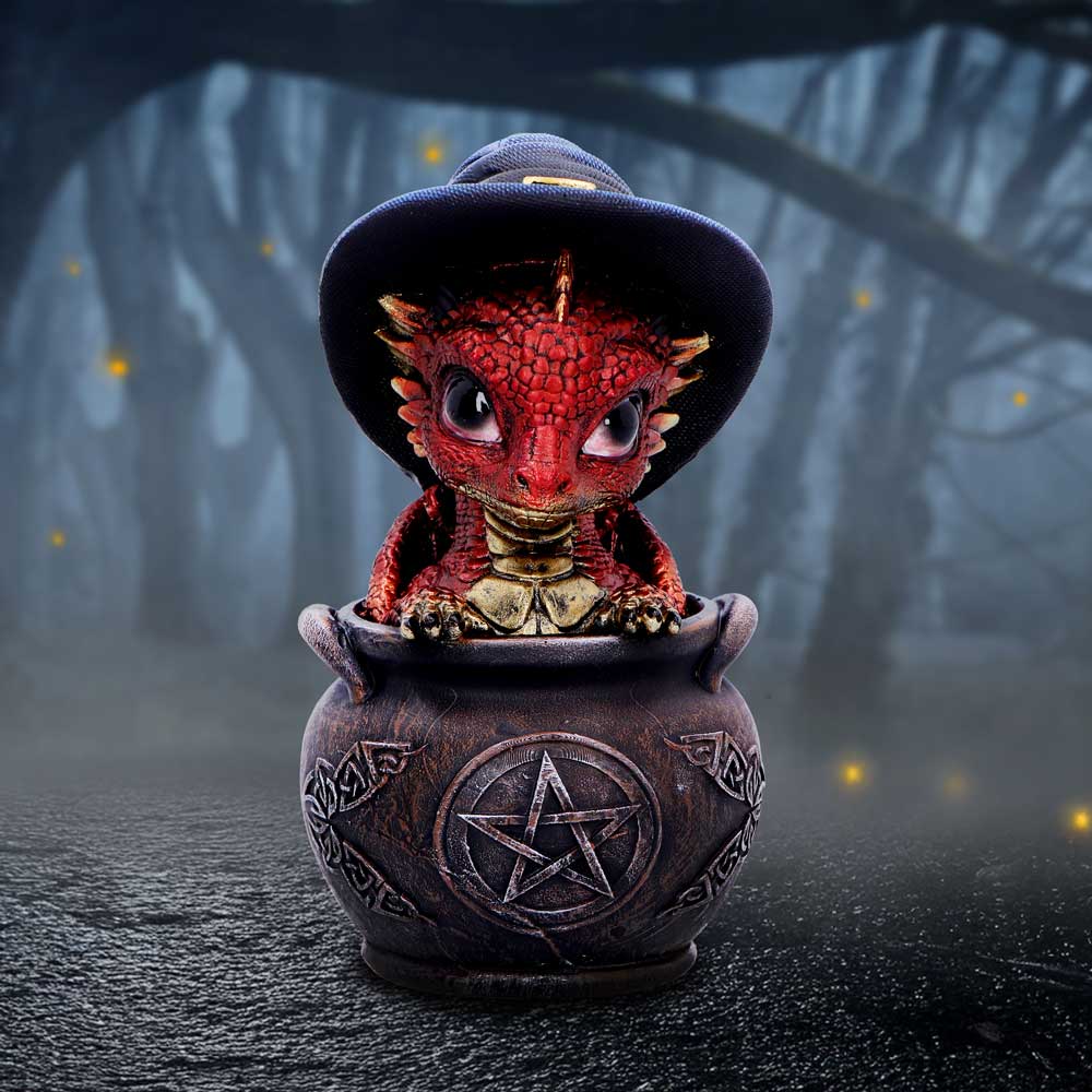 Spell Scale is a charming, small dragon figurine from Nemesis Now that features a playful red dragon popping out of a detailed gothic cauldron. Wearing a classic witch's hat, this magical creature is cast in high-quality resin and hand-painted with vibrant colors and intricate detail. Packaged in a protective, branded box, it's perfect for gifting or displaying. Ideal for fantasy lovers, dragon collectors, and fans of witchy or gothic decor, Spell Scale adds a spark of magic and mischief to any collection.
