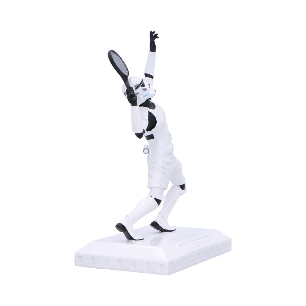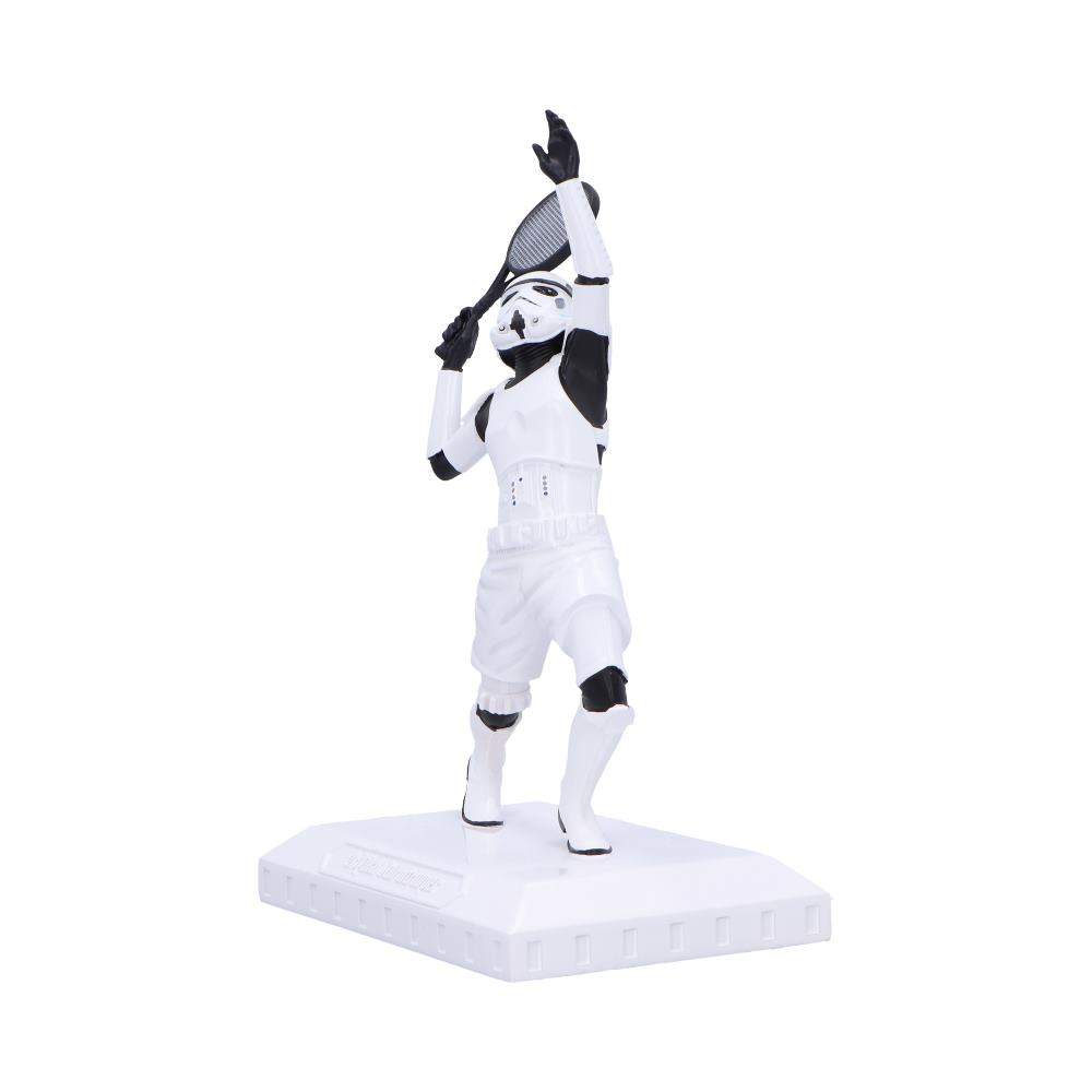 This decorative figurine features a tennis-playing trooper design with white armor and black accents. The resin construction shows excellent detail work throughout the armor plating and sports accessories. Each piece comes complete with a display base for easy presentation. The dynamic pose shows the character in a serving position with racket raised high. This eye-catching collectible appeals to both pop culture enthusiasts and sports fans. The Original Stormtrooper design from Shepperton Studios offers recognizable appeal that makes this a popular gift item and impulse purchase for those seeking distinctive decorative pieces.